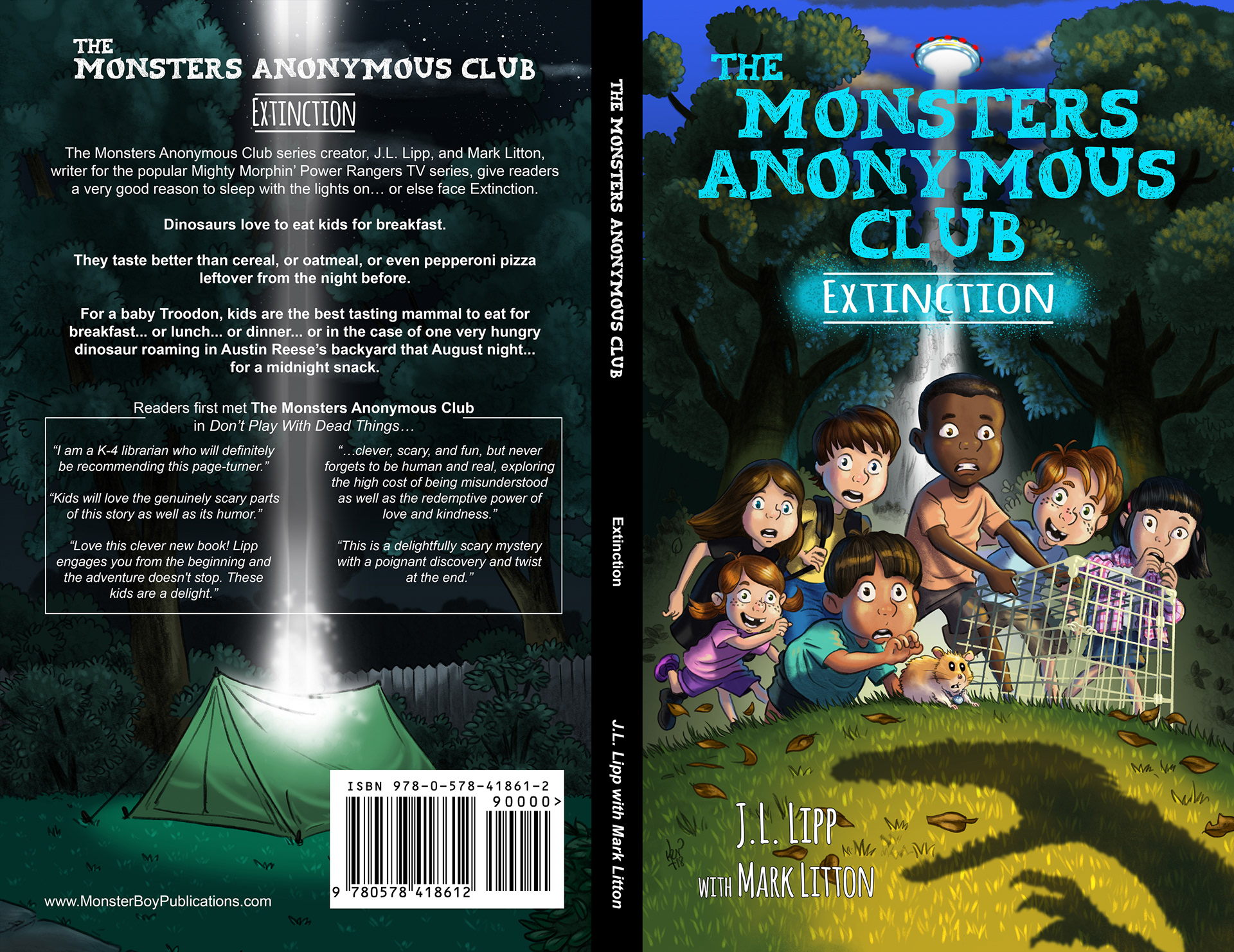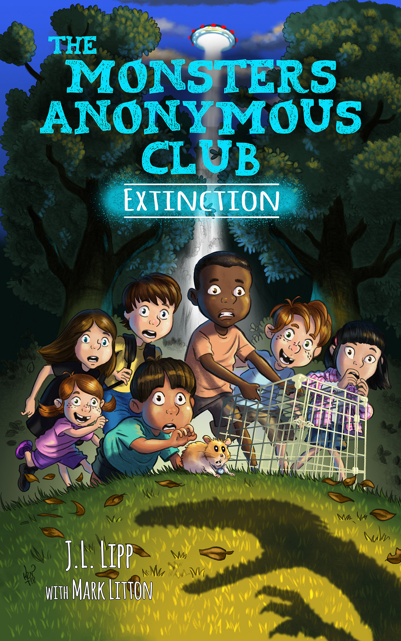 Book cover illustration and design for the children's novel The Monsters Anonymous Club: Extinction, written by J.L. Lipp with Mark Litton.